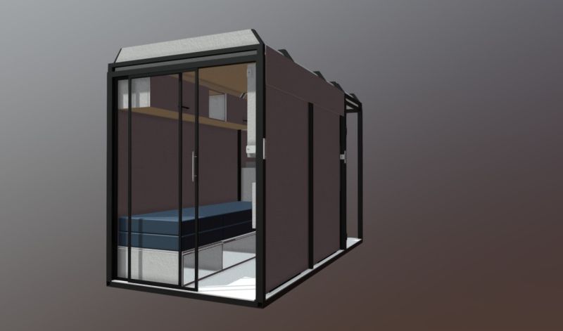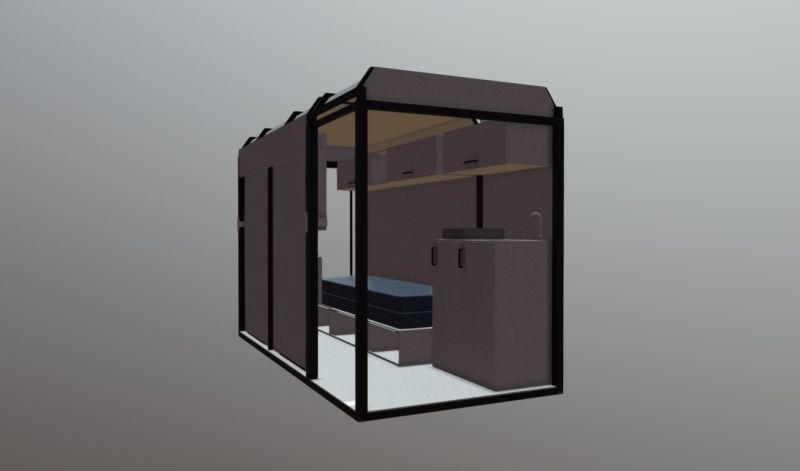 Кухненският модул може да има отворени стени , за да се улесни страничният вход или преминаването от кабината на водача директно към кухненския или душ модула.